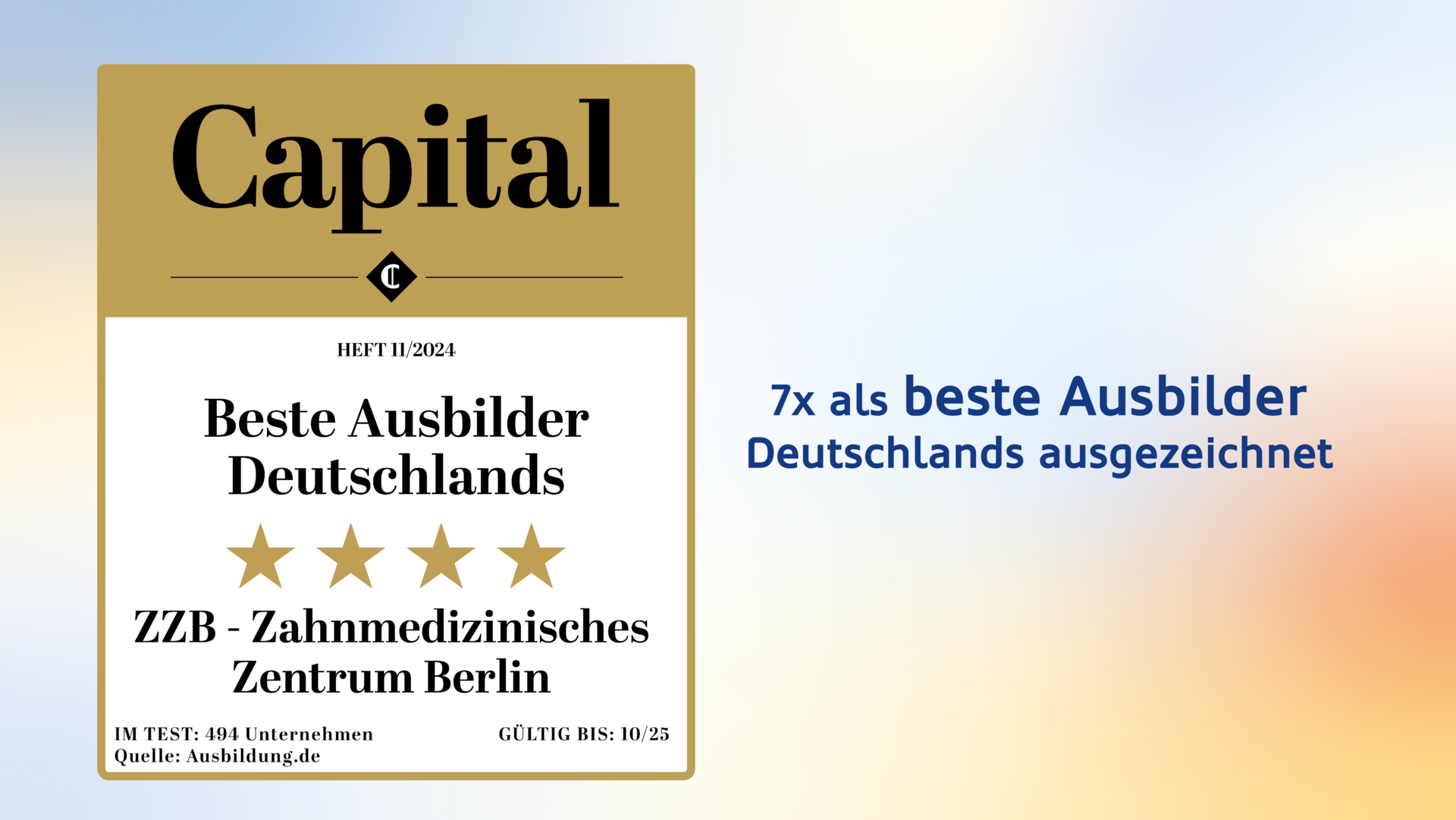 2024 kürt uns das Wirtschaftsmagazin Capital in Kooperation mit dem Portal Ausbildung.de zu einem der "Besten Ausbilder Deutschlands". Bewertet wurden wir in Hinblick auf Betreuung, Lernen im Betrieb, Engagement des Unternehmens, Erfolgschancen und innovative Lehrmethoden und erreichten dabei 4 von möglichen 5 Sternen.
